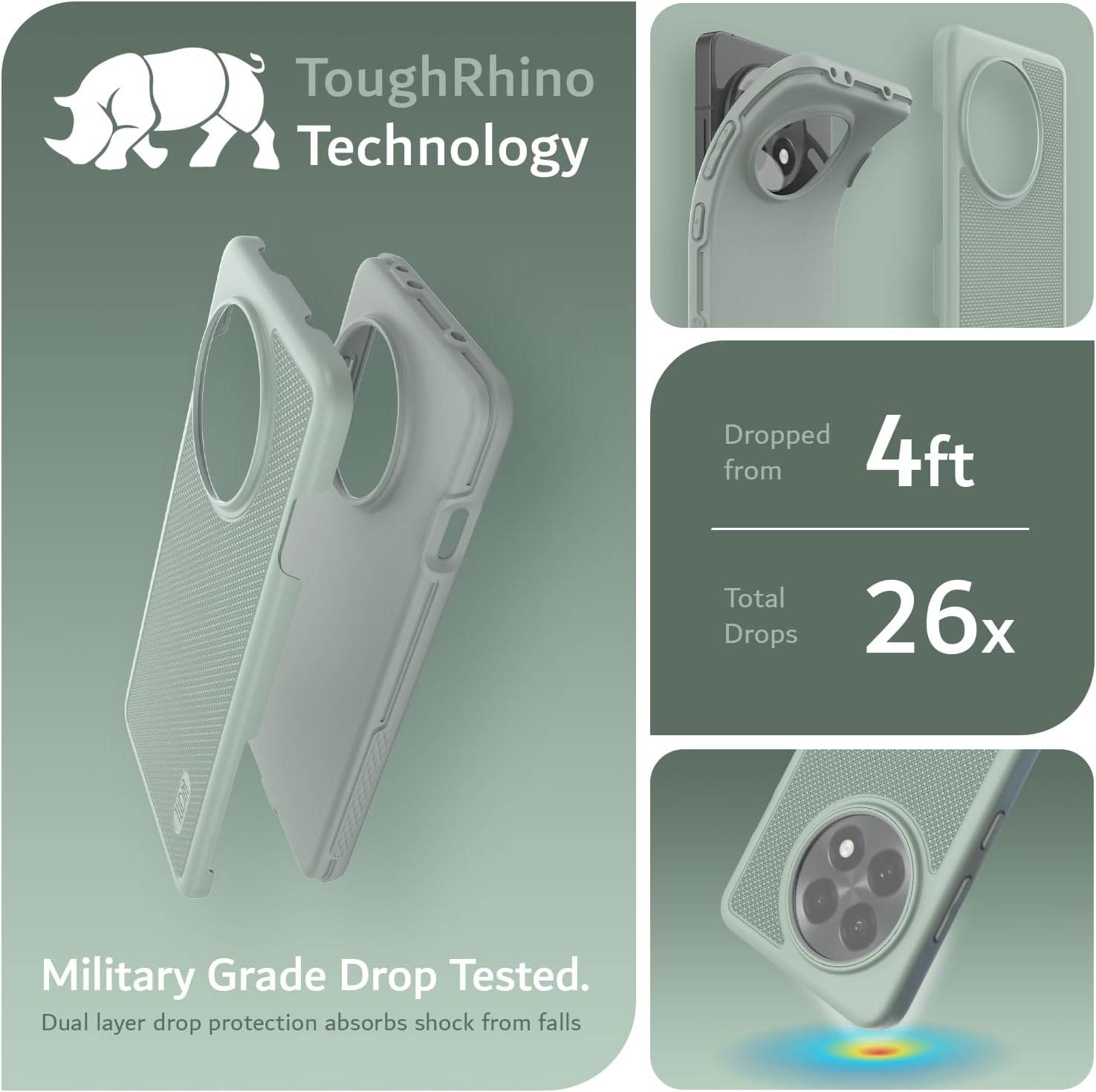 - Gecertificeerde bescherming van militaire kwaliteit en ToughRhino-technologie voor dubbellaagse bescherming tegen vallen en krassen.