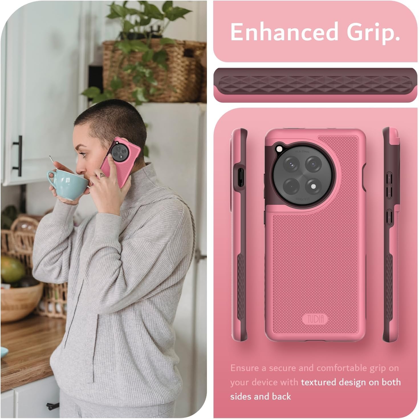 De grip textuur aan de zijkant van de case geeft meer vertrouwen wanneer je jouw OnePlus 12R in de hand hebt. Samen met de precisie waarmee deze Tudia hoes wordt gemaakt behoudt je het klik gevoel van jouw knoppen op de OnePlus 12R zonder in te leveren op bescherming of functionaliteit.