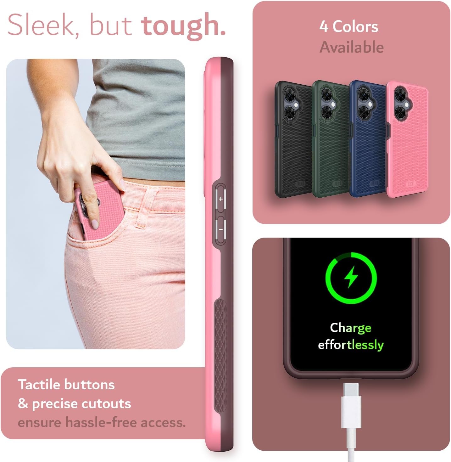 De grip textuur aan de zijkant van de case geeft meer vertrouwen wanneer je jouw OnePlus Nord CE 3 Lite in de hand hebt. Samen met de precisie waarmee deze Tudia hoes wordt gemaakt behoudt je het klik gevoel van jouw knoppen op de OnePlus Nord CE 3 Lite zonder in te leveren op bescherming of functionaliteit.